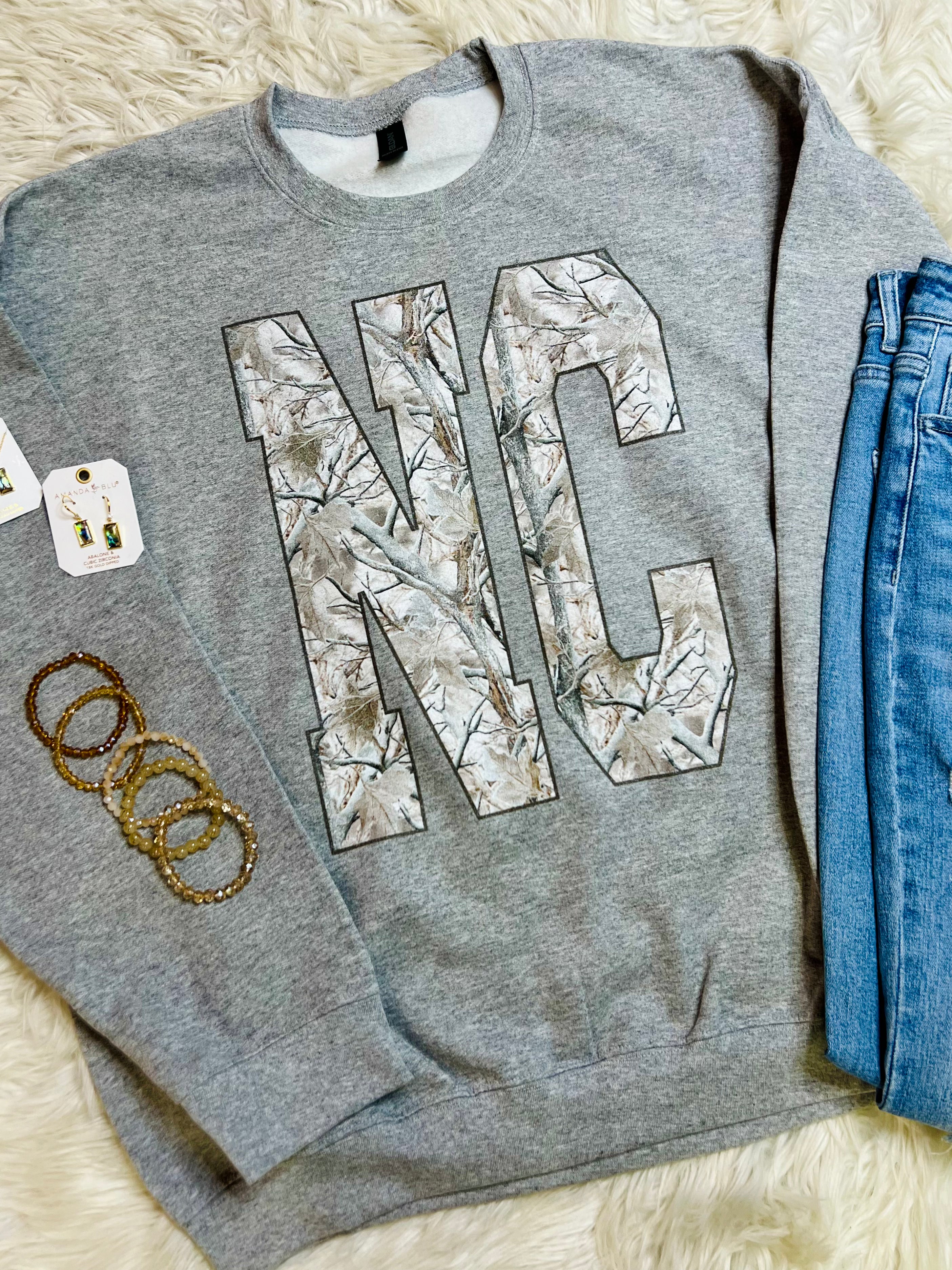 Oversized camo NC design on a Gildan unisex crewneck. Want it to say something else in this print? Just message us and we can get you taken care of