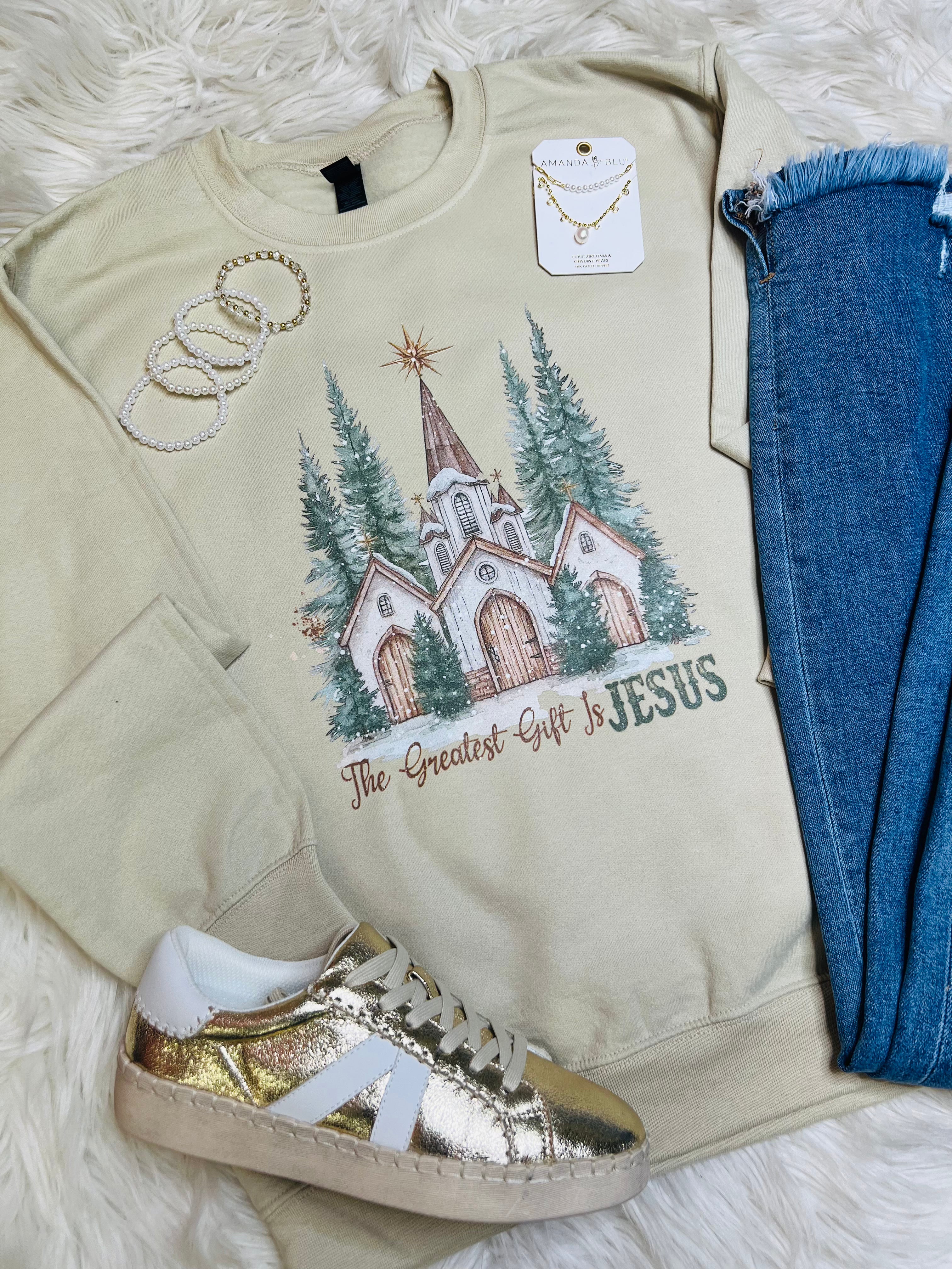 The Greatest Gift is Jesus design on a Gildan unisex crewneck. Perfect to add to your holiday wardrobe