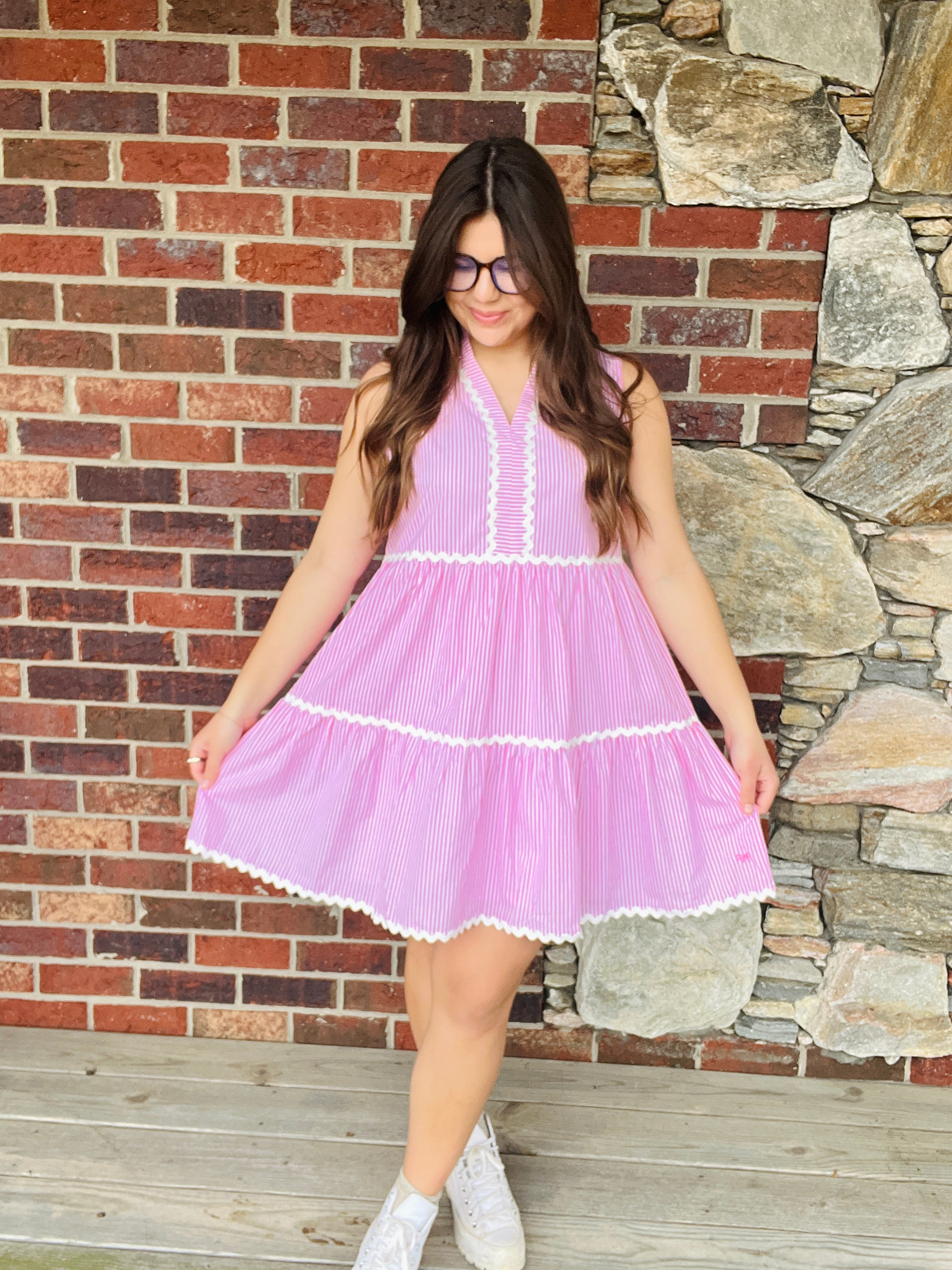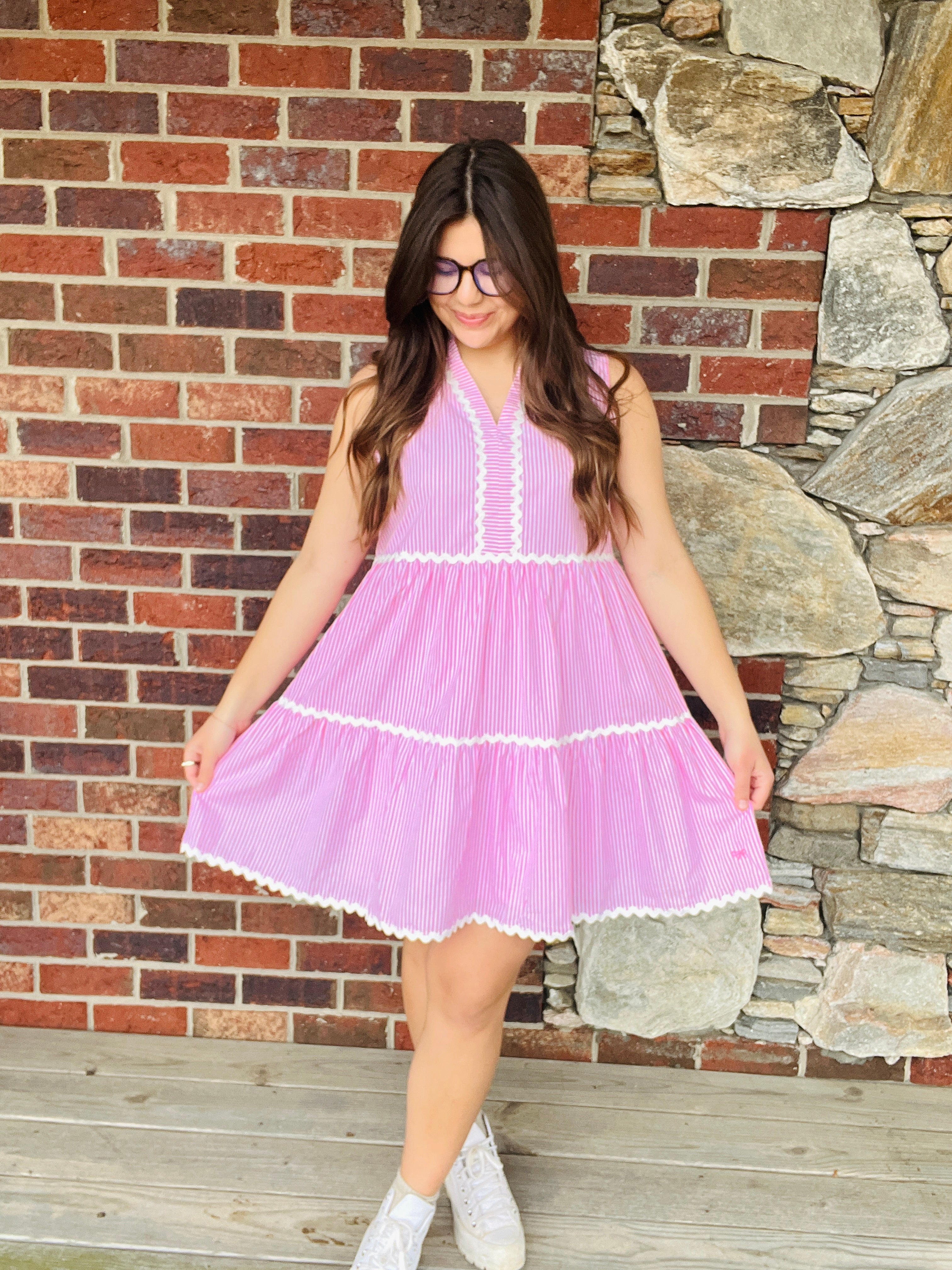 The Coastal Prep Dress features a v-neckline, tiered skirt, above the knee fit, and sleeveless silhouette. Shell made of 100% cotton. Lining made of 100% polyester.