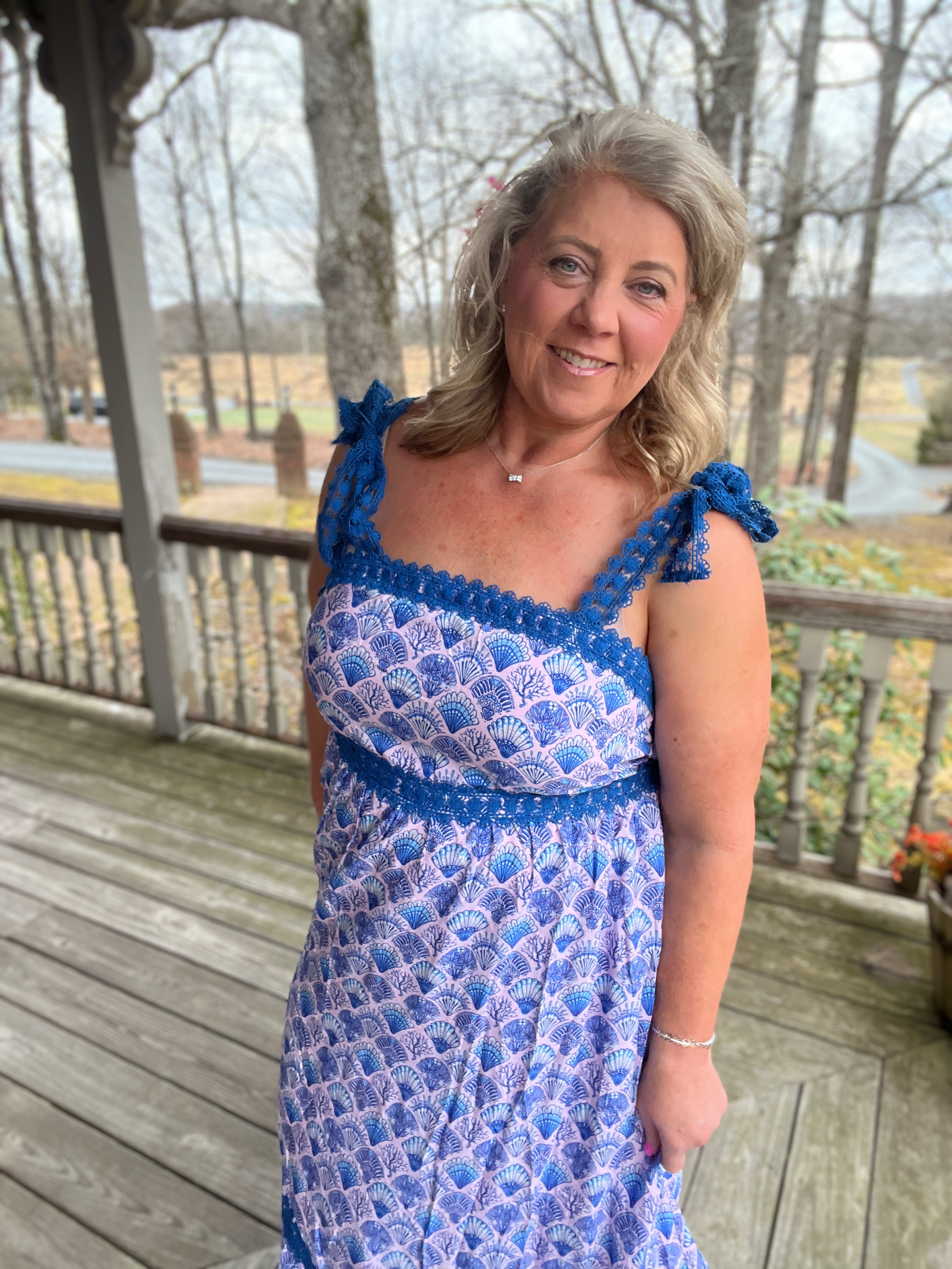 The Coastal Tie Dress features tie shoulder straps, an empire waistline, tiered skirt with lace detail, and maxi length. Shell made of 80% viscose and 20% polyamide. Lining made of 100% polyester.