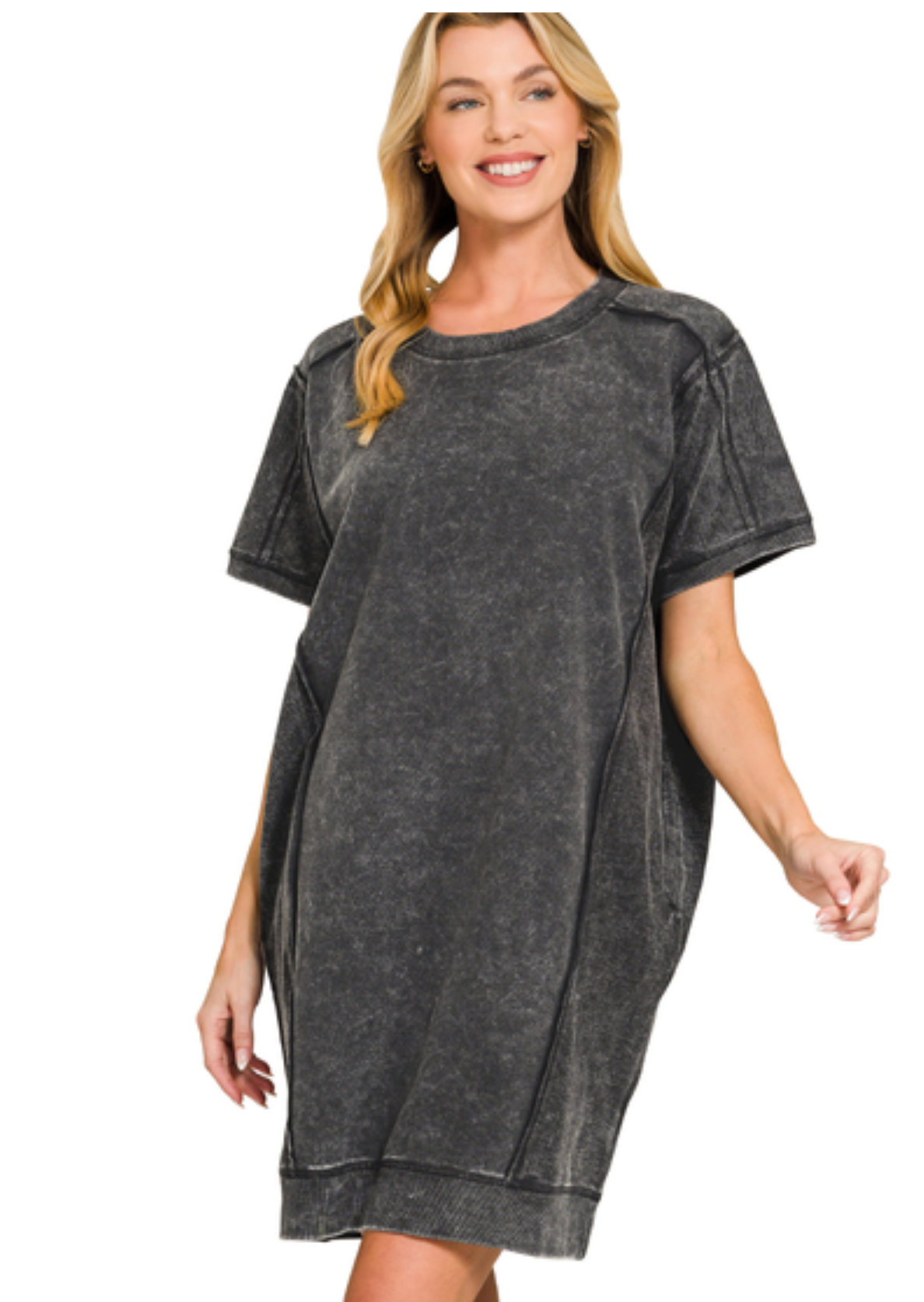FRENCH TERRY ACID WASH SHORT SLEEVE DRESS WITH POCKETS