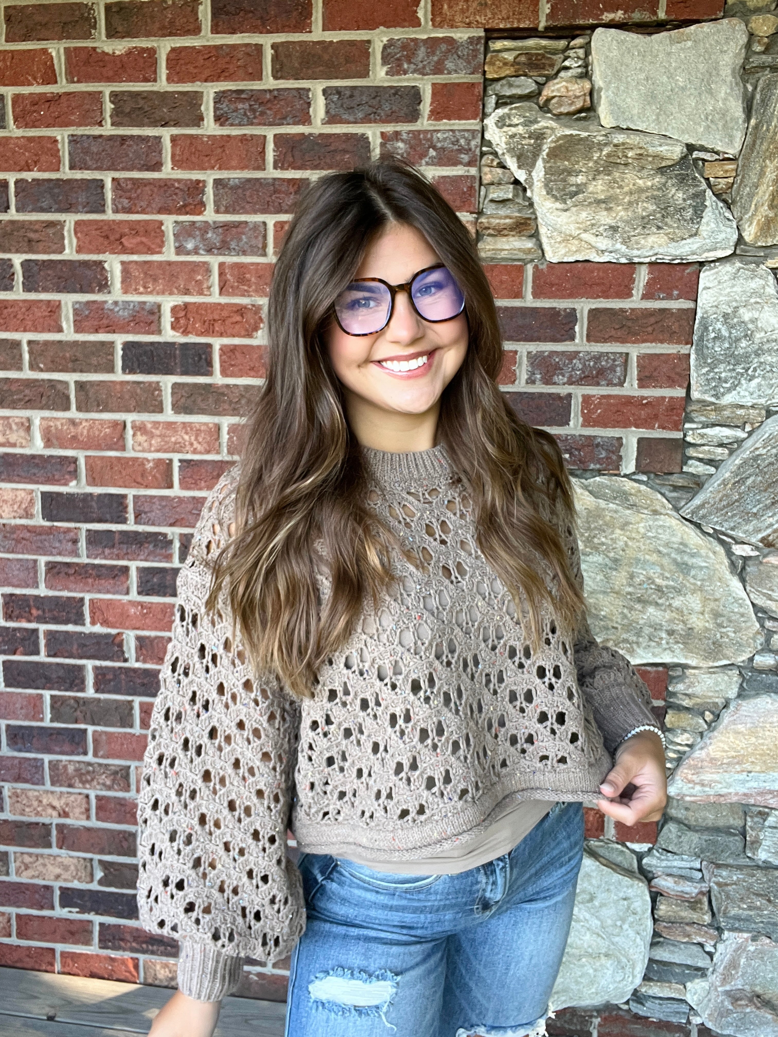 This cropped crochet knit sweater features stylish balloon sleeves and offers a comfortable fit with a total body length of approximately 16" and a chest measurement around 49", based on a size S/M. Please note that colors may appear slightly different depending on your monitor settings.