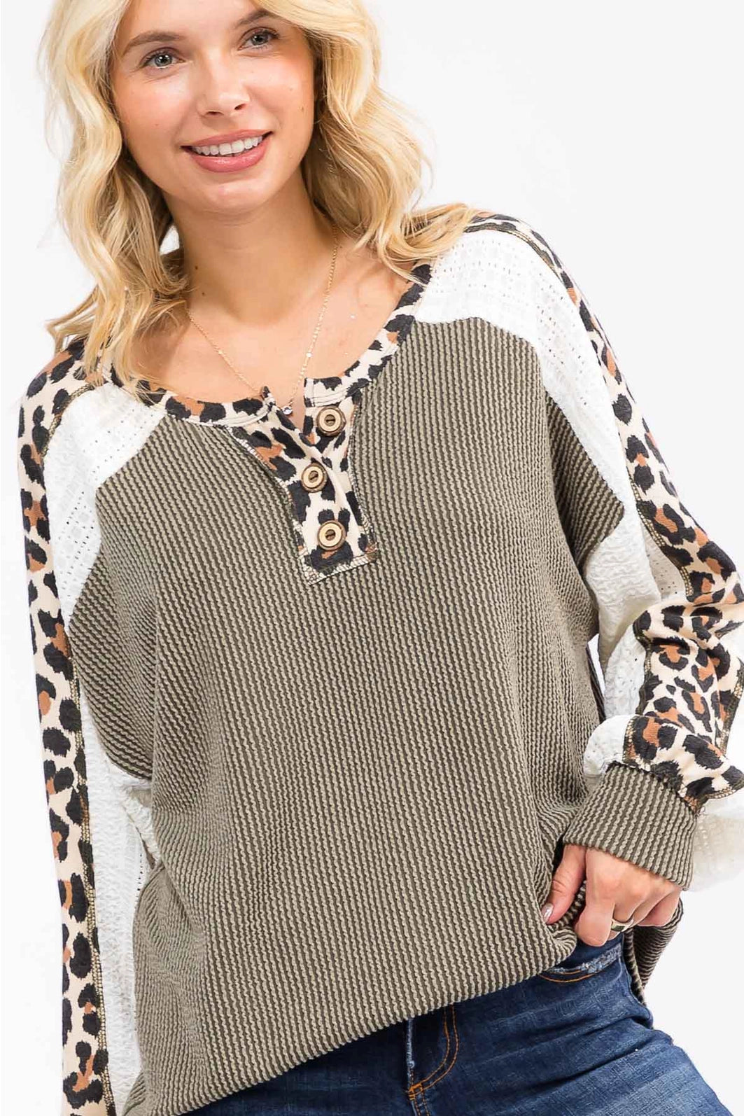 A rib knit pullover top featuring a leopard & lace contrast detail on sleeves, leopard button placket, long sleeves, and a relaxed fit. (each one is unique) *model is wearing size small