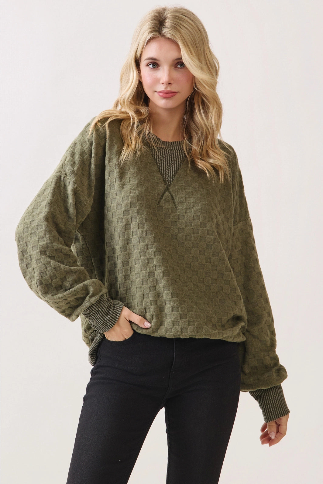 Soft cozy textured checkered knit sweater. designed with a soft checker inspired pattern and a v stitch detail, this neutral pullover offers a timeless and relaxed fit. Featuring a ribbed contrast on neckline, cuffs and hem that brings a stylish finishing touch.