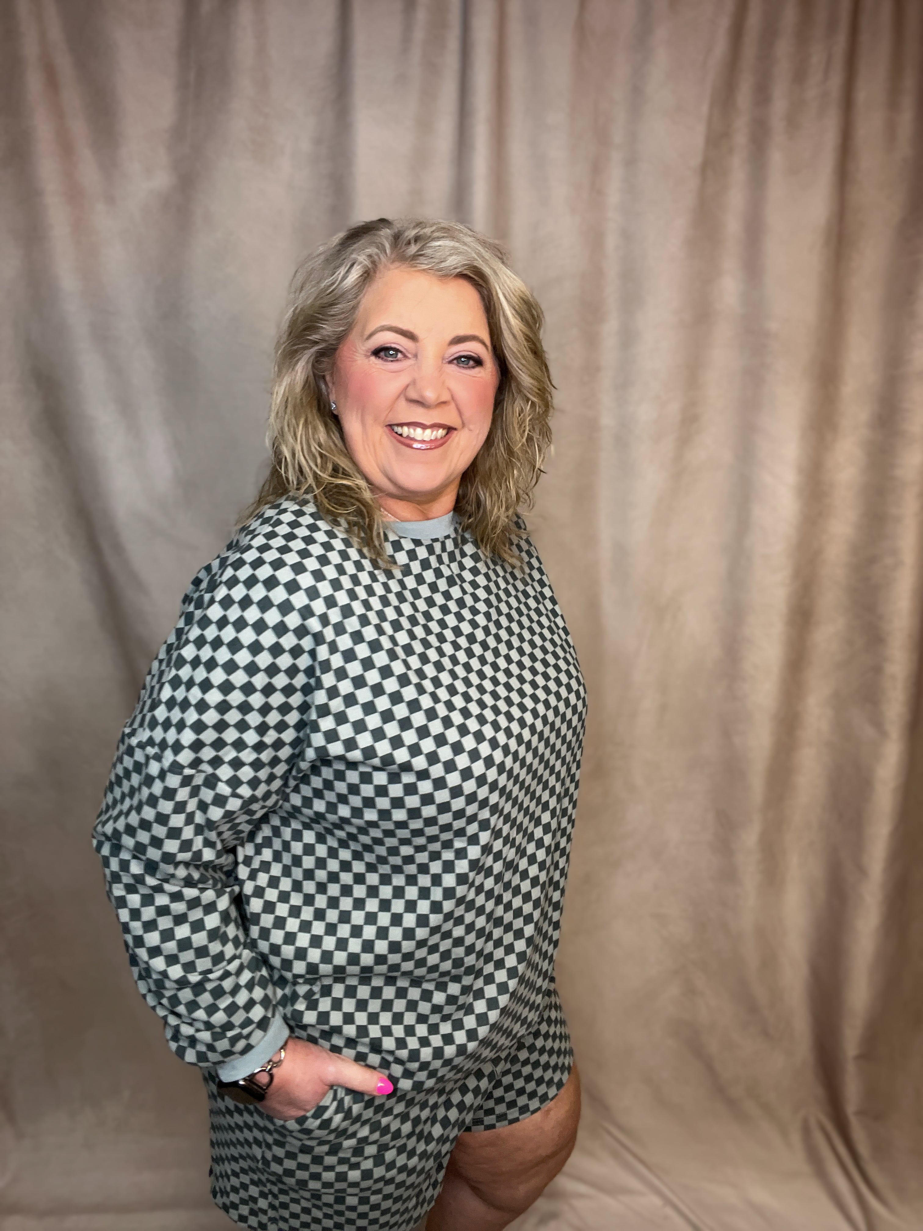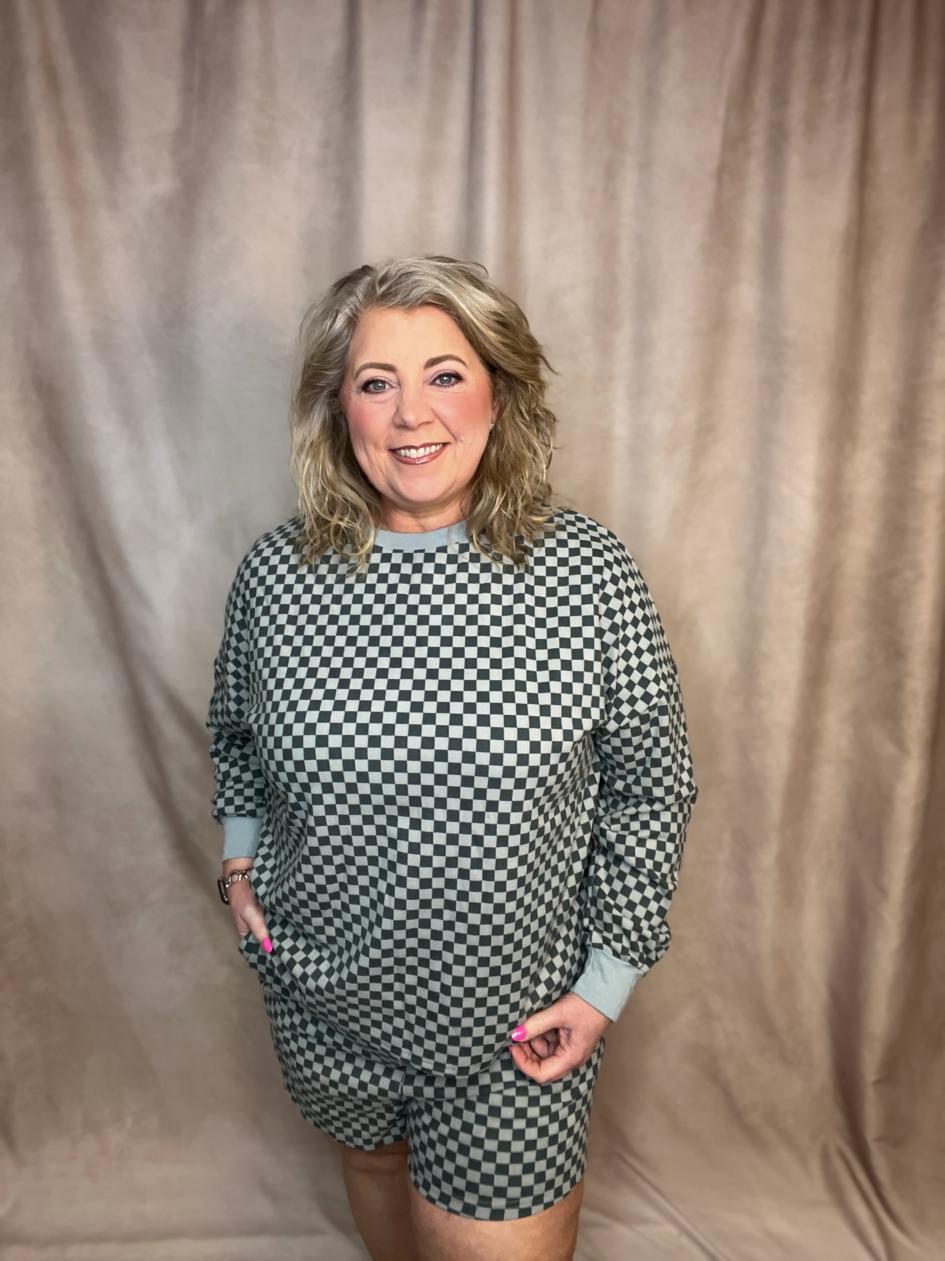 CHECKERBOARD SOFT BRUSHED KNIT PULLOVER & SHORTS - CHECKERBOARD PATTERN - SOFT BRUSHED KNIT - ELASTIC TIE WAIST BAND - LOOSE FIT - TOP & SHORTS SET