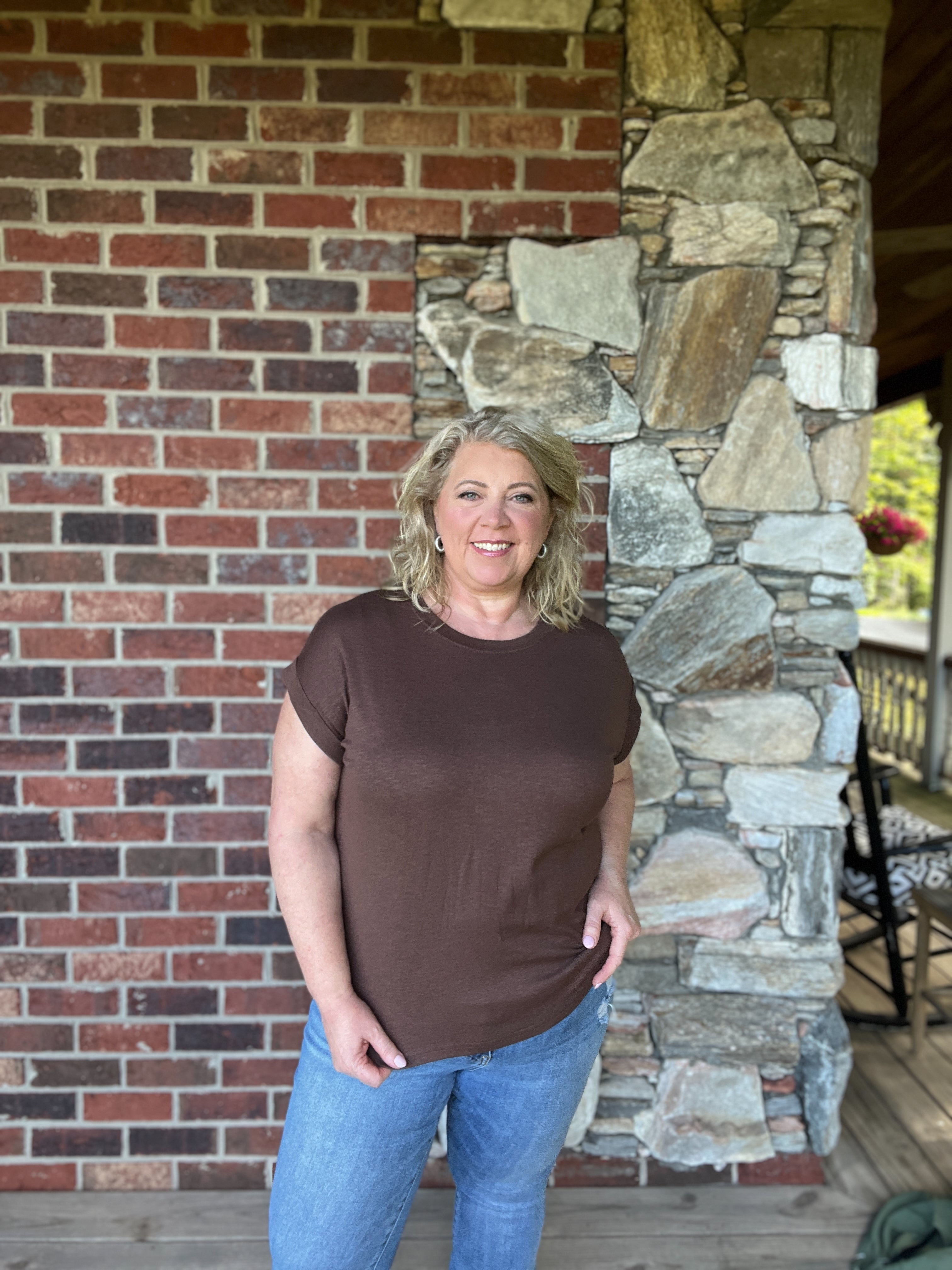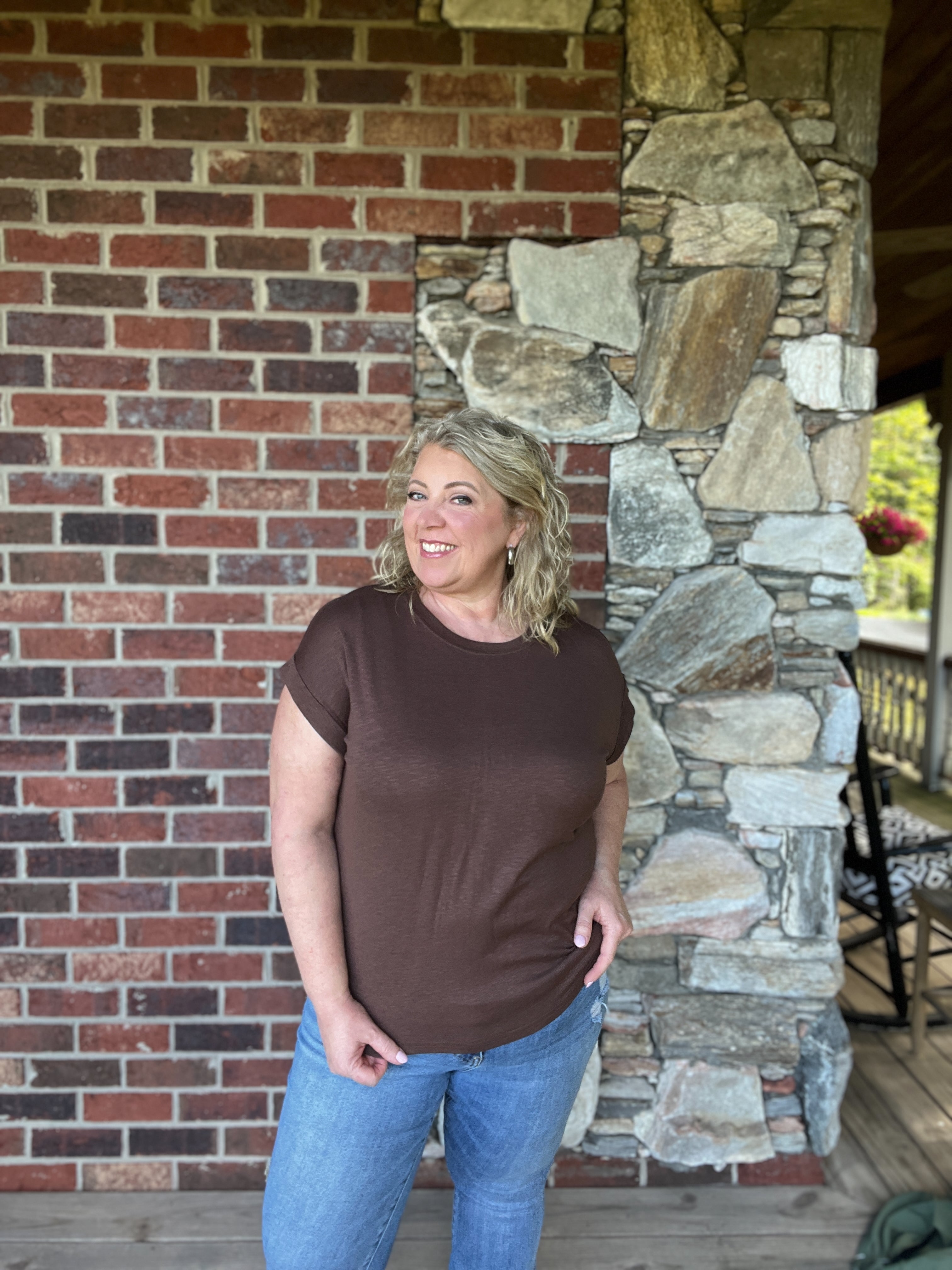 This cotton modal slub tee features rolled sleeves for a relaxed look. It measures approximately 24" in total body length and 42" across the chest, based on a small size. Please note that colors may appear slightly different depending on your screen settings.