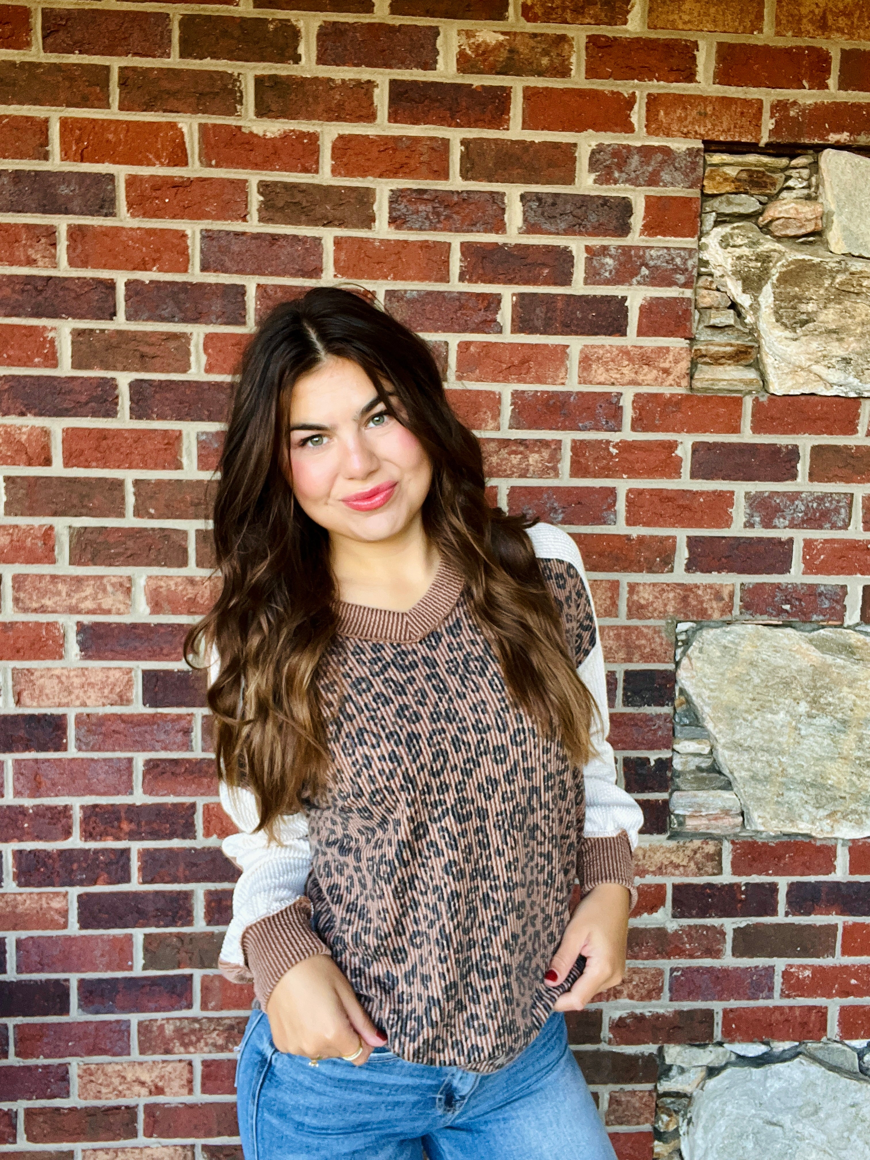 A RIB COLOR BLOCK TOP FEATURING AN ANIMAL PRINT, V NECKLINE, BISHOP SLEEVES, EXPOSED STITCH,CURVED HEM, AND A RELAXED FIT. (EACH ONE IS UNIQUE) *MODEL IS WEARING SIZE SMALL