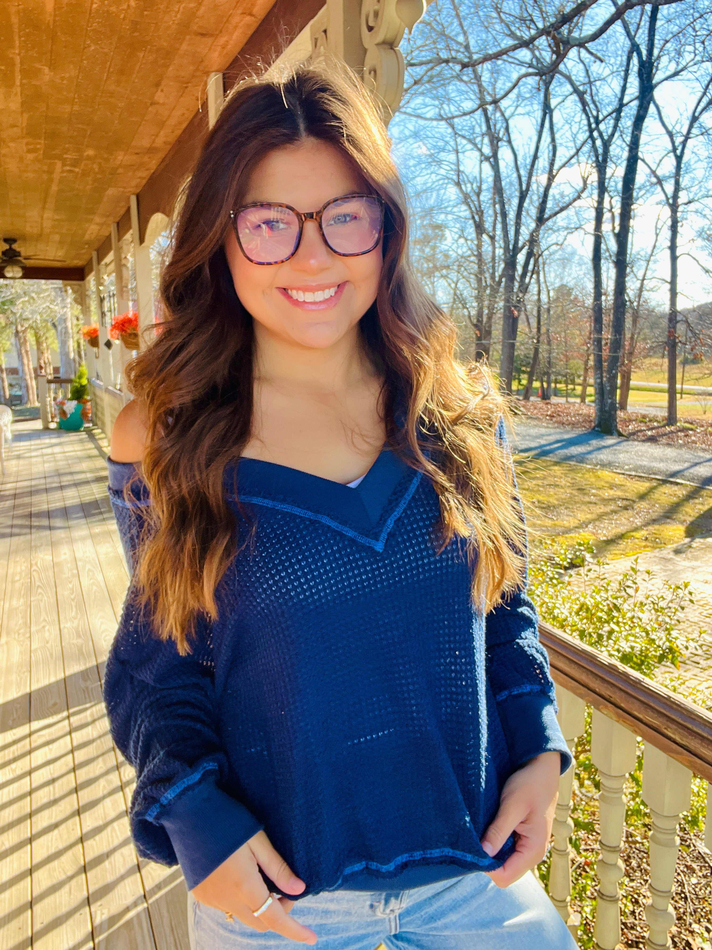Totally timeless in a staple waffle knit fabrication, this effortlessly essential thermal is featured in a drapey and relaxed fit, wide v-neckline, dropped shoulders and exposed seaming detail. Perfect layering piece for cooler weather, layer with your favorite bralette or sleeveless top inside to give a variety look. loose fit, wide v-neck, off shoulder, exposed seaming detail, layering piece, long sleeve top, waffle fabric top, raw edge detail, breathable material