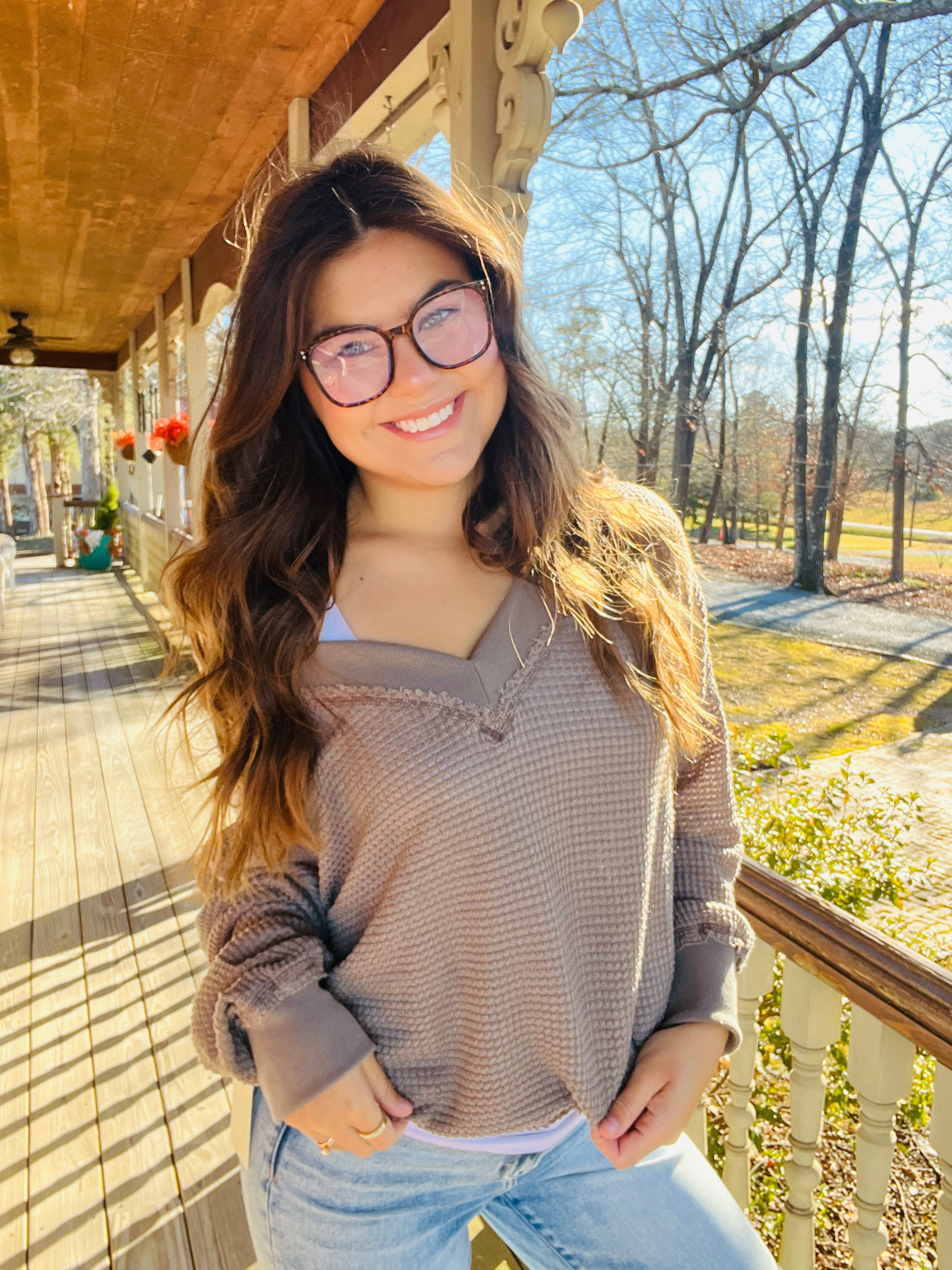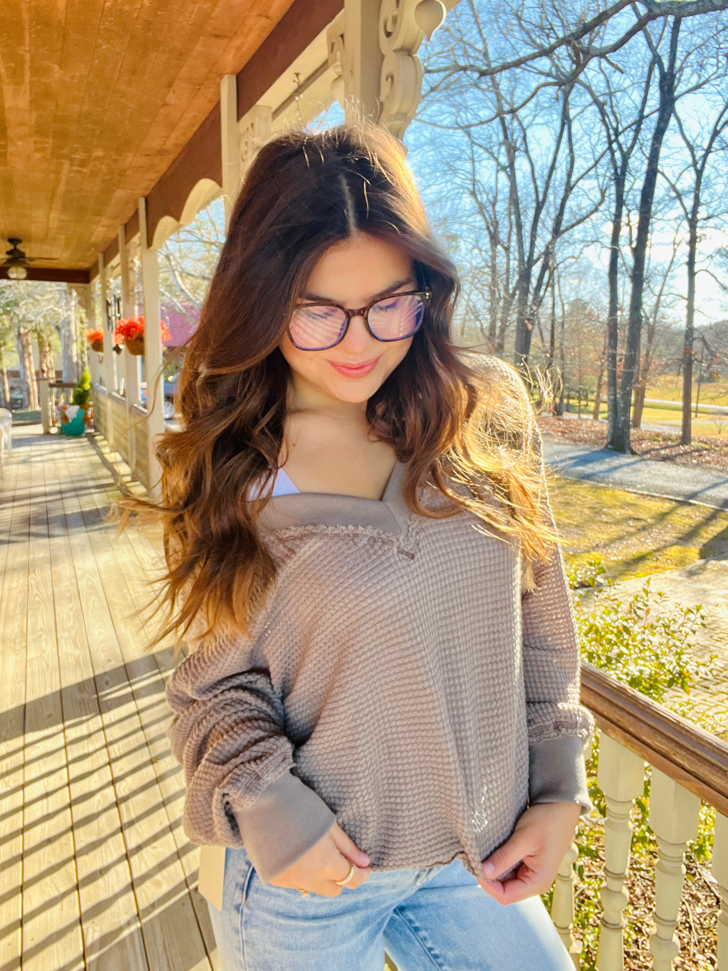 Mocha Loose Fit V-Neck Waffle Textured Long Sleeve Top