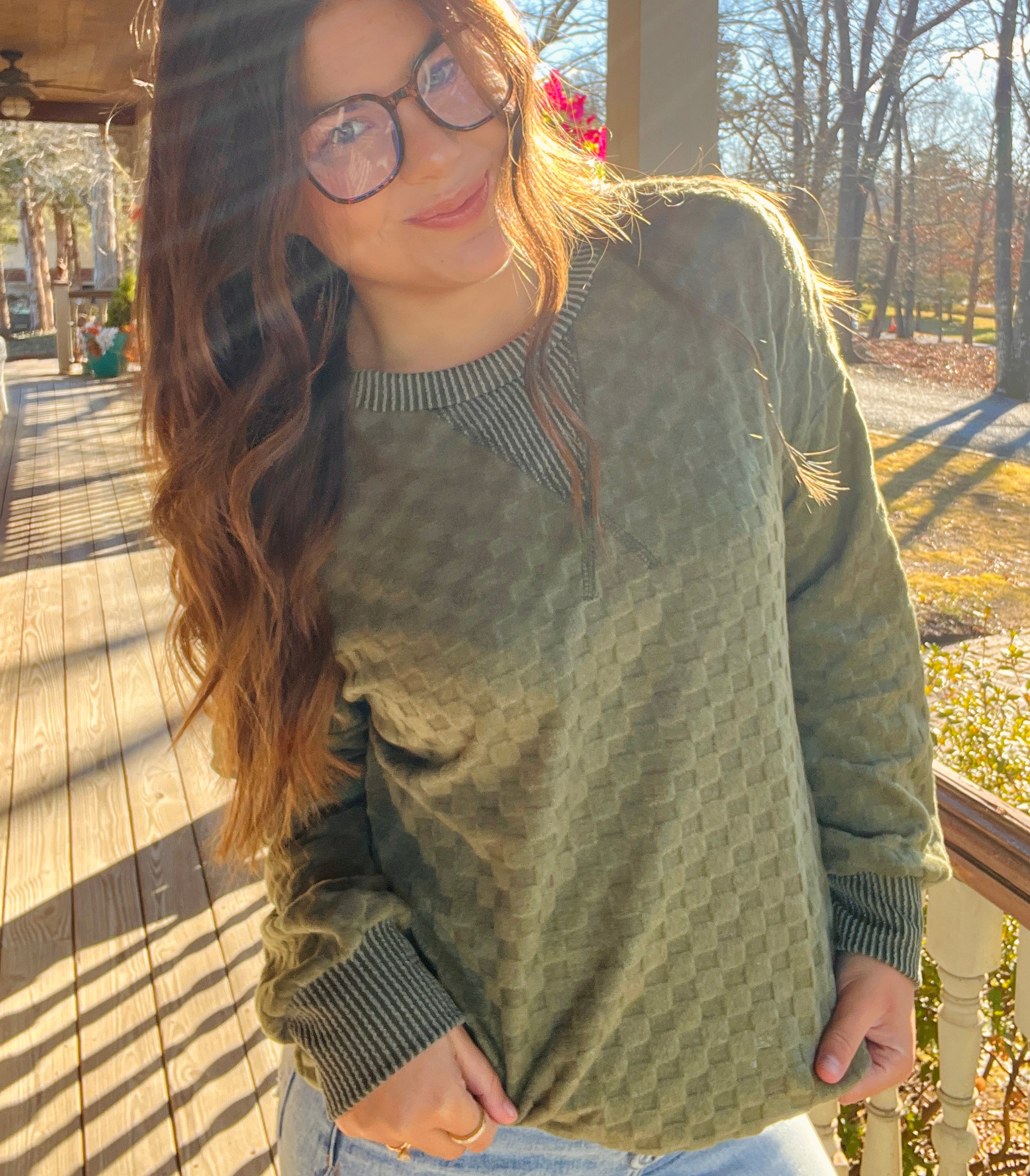 Soft cozy textured checkered knit sweater. designed with a soft checker inspired pattern and a v stitch detail, this neutral pullover offers a timeless and relaxed fit. Featuring a ribbed contrast on neckline, cuffs and hem that brings a stylish finishing touch.