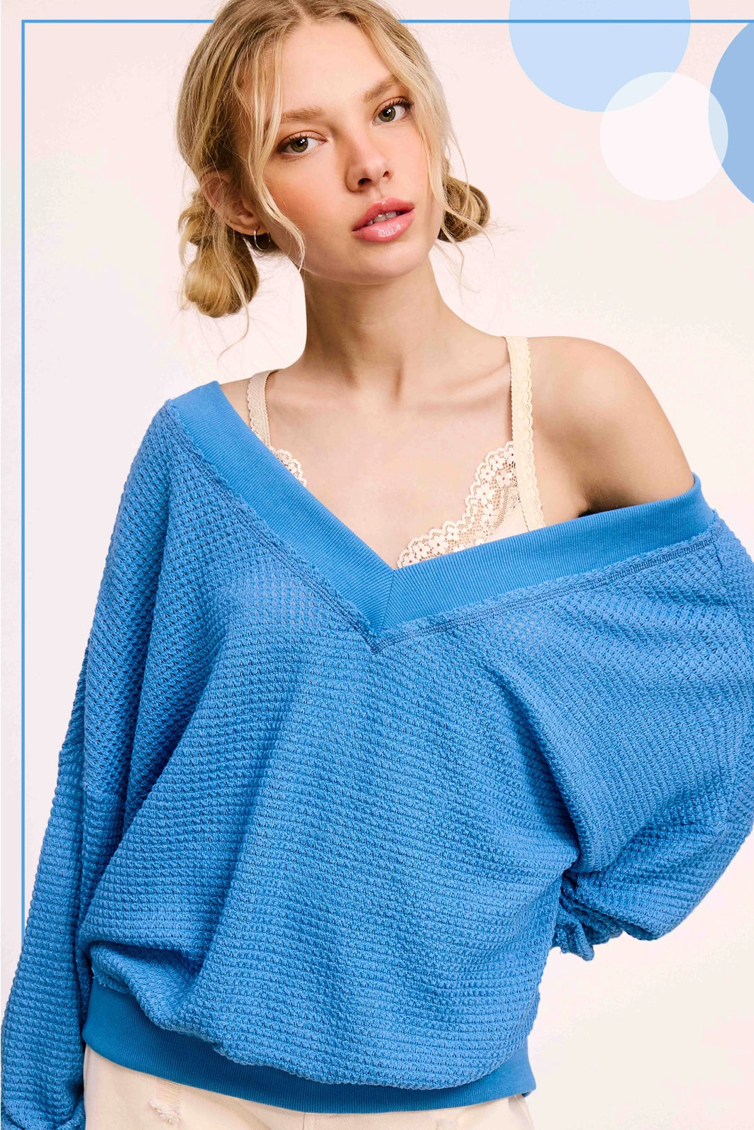 Sky Loose Fit V-Neck Waffle Textured Long Sleeve Top