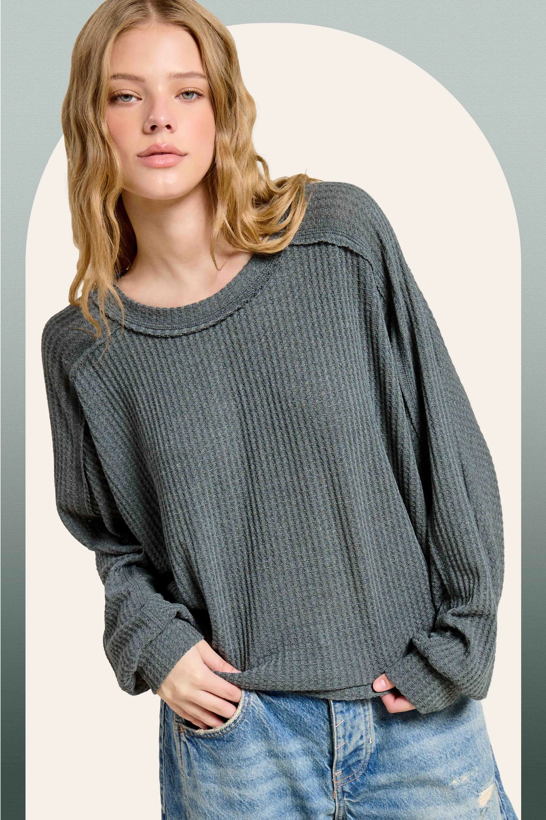 Lightweight material with waffle knit texture reverse stitch top with round neckline, long sleeves and slouchy fit with straight raw-cut hemline.